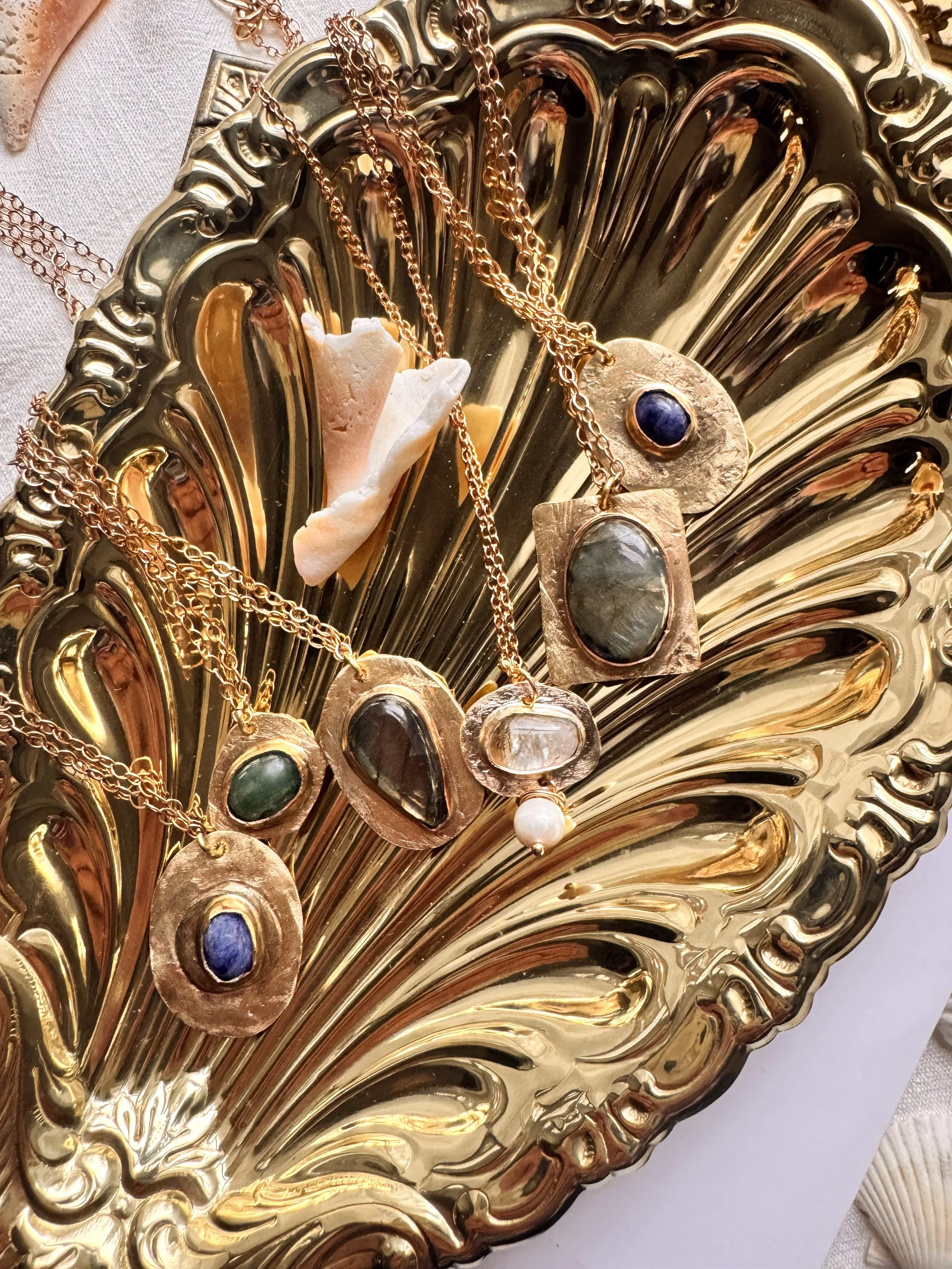 Each necklace is shaped and finished by hand, designed to soften, deepen and develop character with wear. Labradorite, lapis, and deep stones catch the light in quiet flashes, set in warm brass that feels both ancient and enduring.